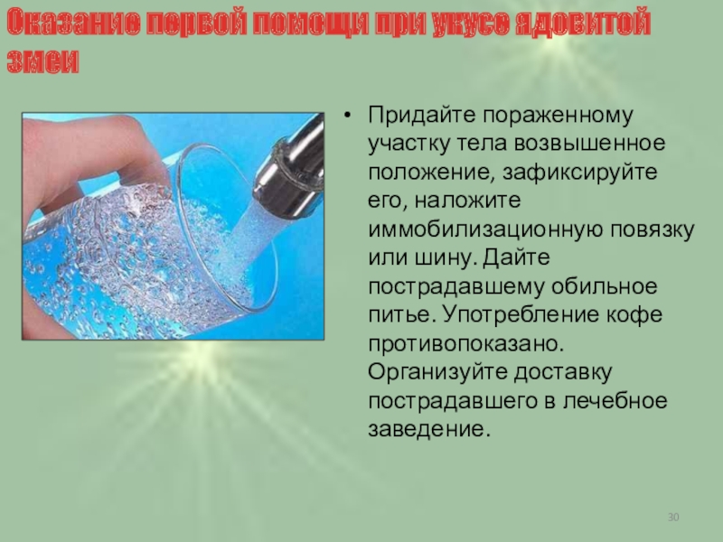 Слайд 30Придайте пораженному участку тела возвышенное положение, зафиксируйте его, наложите иммобилизационную повязку