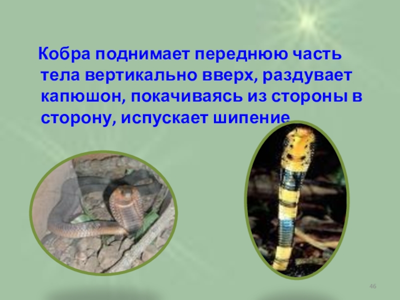 Слайд 46 Кобра поднимает переднюю часть тела вертикально вверх, раздувает капюшон,