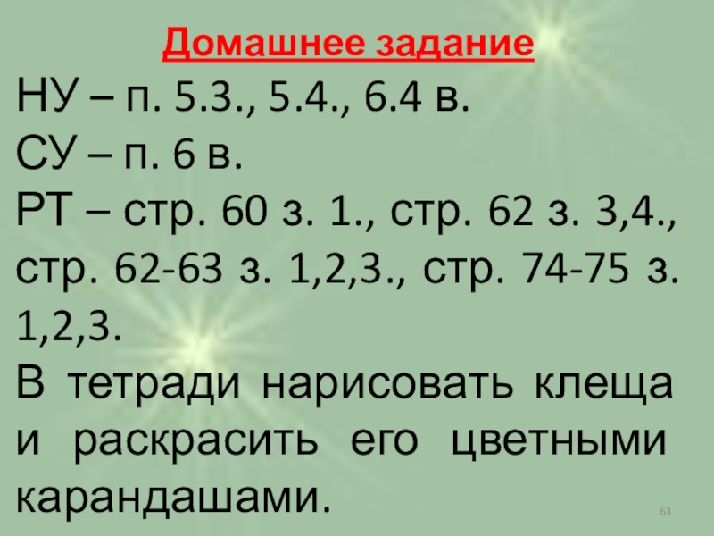 РТ – стр. 60 з. 1., стр. 62 з. 3,4., стр. 62-63 з. 1,2,3., стр. 74-75 з. 1,2,3.