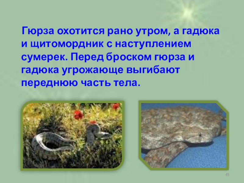 Слайд 45 Гюрза охотится рано утром, а гадюка и щитомордник с