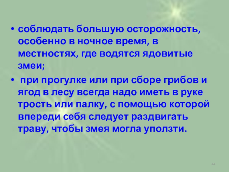 Слайд 44соблюдать большую осторожность, особенно в ночное время, в местностях, где водятся