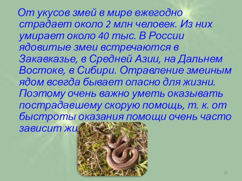 Слайд 18 От укусов змей в мире ежегодно страдает около 2