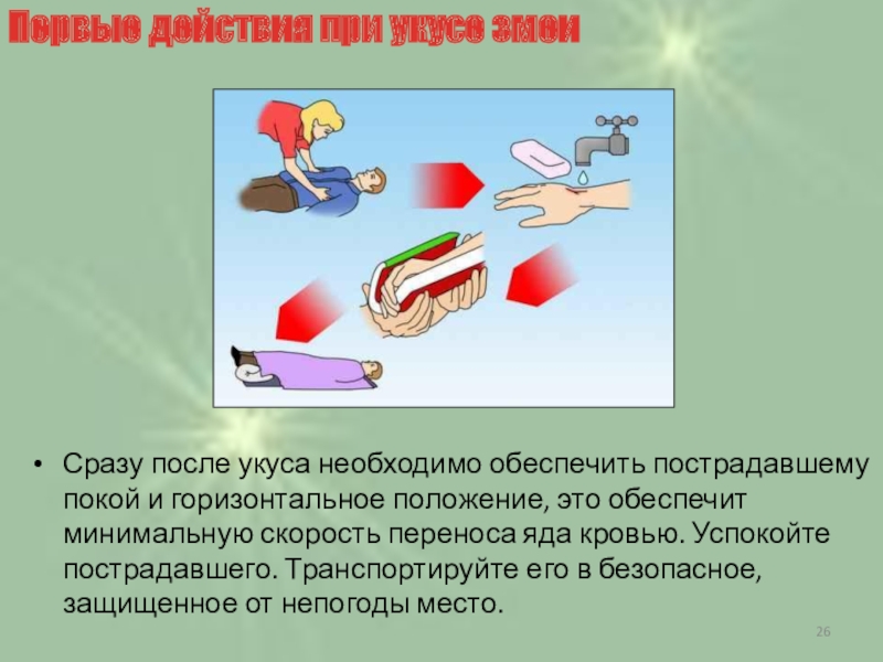 Слайд 26Сразу после укуса необходимо обеспечить пострадавшему покой и горизонтальное положение, это