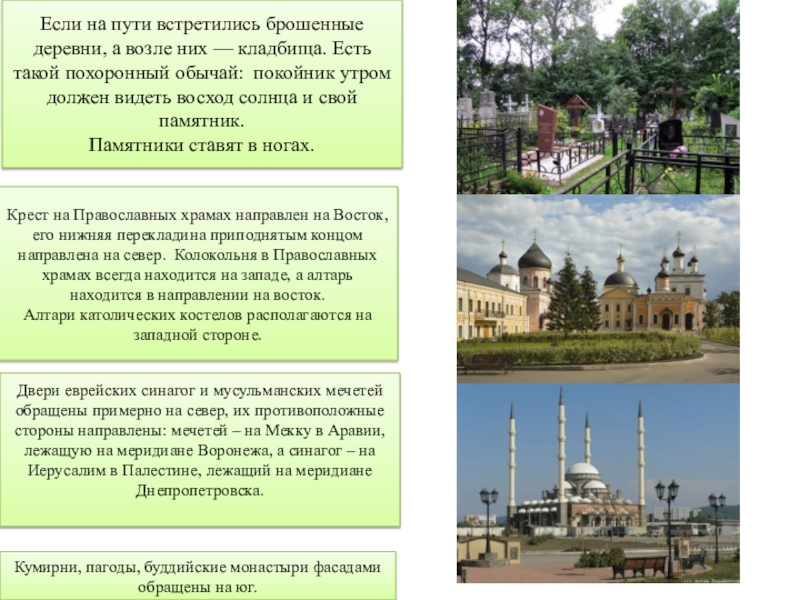 Двери еврейских синагог и мусульманских мечетей обращены примерно на север, их противоположные стороны направлены: мечетей – на Мекку в Аравии, лежащую на меридиане Воронежа, а синагог – на Иерусалим в Палестине, лежащий на меридиане Днепропетровска.