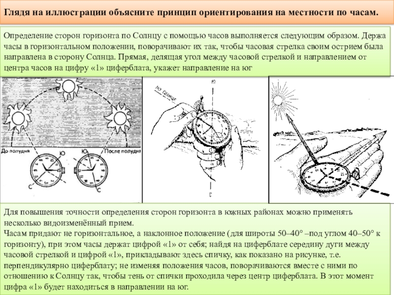 Определение сторон горизонта по Солнцу с помощью часов выполняется следующим образом. Держа часы в горизонтальном положении, поворачивают их так, чтобы часовая стрелка своим острием была направлена в сторону Солнца. Прямая, делящая угол между часовой стрелкой и направлением от центра часов на цифру «1» циферблата, укажет направление на юг