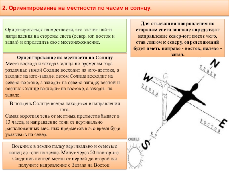 Самая короткая тень от местных предметов бывает в 13 часов, и направление тени от вертикально расположенных местных предметов в это время будет указывать на север.