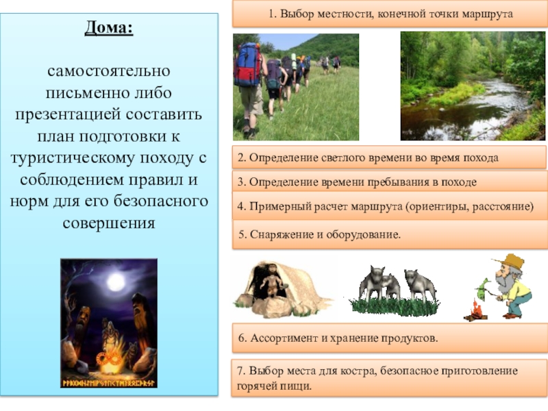 7. Выбор места для костра, безопасное приготовление горячей пищи.