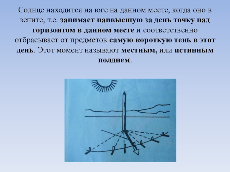 Слайд 4Солнце находится на юге на данном месте, когда оно в зените,