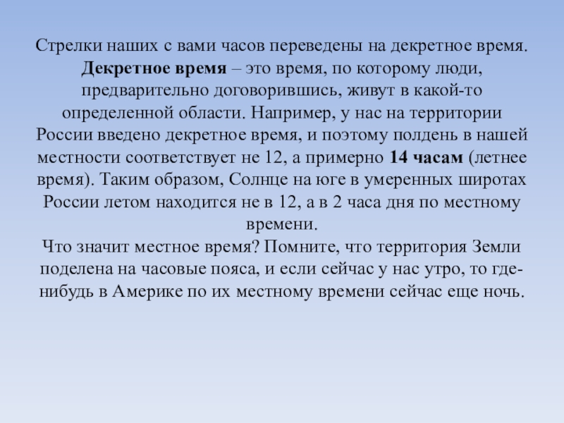 Стрелки наших с вами часов переведены на декретное время. Декретное время – это время, по которому люди, предварительно договорившись, живут в какой-то определенной области. Например, у нас на территории России введено декретное время, и поэтому полдень