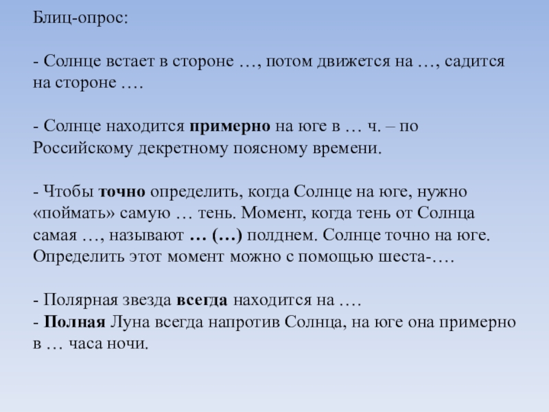 Слайд 6Блиц-опрос: - Солнце встает в стороне …, потом движется на …, садится