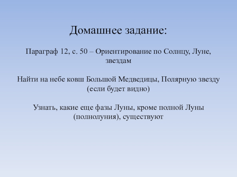 Домашнее задание:  Параграф 12, с. 50 – Ориентирование по Солнцу, Луне, звездам  Найти на небе