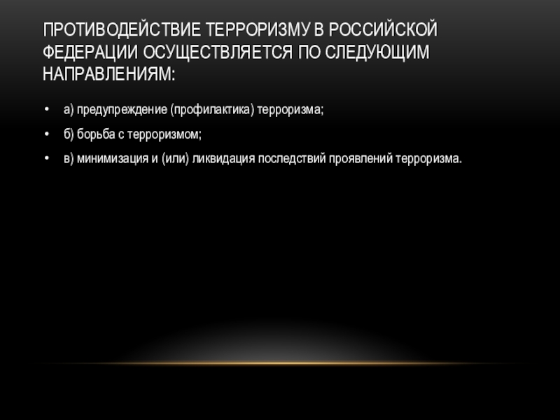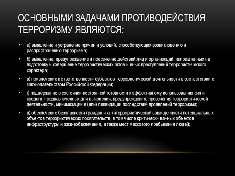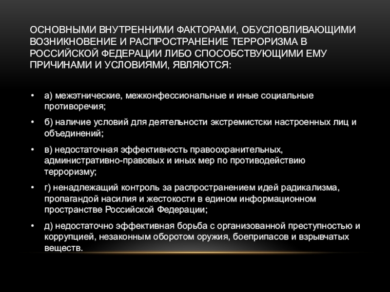 в) недостаточная эффективность правоохранительных, административно-правовых и иных мер по противодействию терроризму;