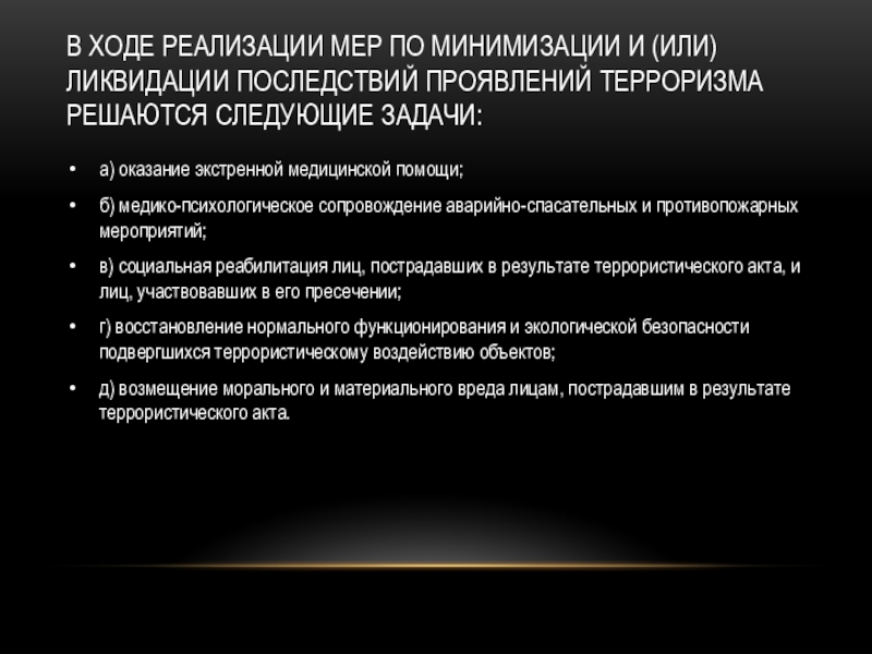 д) возмещение морального и материального вреда лицам, пострадавшим в результате террористического акта.