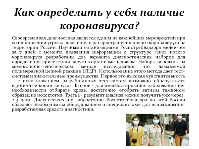 мероприятий при возникновении угрозы появления и распространения нового коронавируса на территории России. Научными организациями Роспотребнадзора менее чем за 7 дней с момента появления информации о структуре генов нового коронавируса разработаны два варианта диагностических наборов для определения присутствия вируса в организме человека. Наборы основаны на молекулярно-генетическом методе исследования, так называемой полимеразной цепной реакции (ПЦР). Использование этого метода дает тест-системам значительные преимущества. Первое это высокая чувствительность – с использованием разработанных тест-систем возможно обнаруживать единичные копии вирусов. Второе - для диагностирования заболевания нет необходимости отбирать кровь, достаточно отобрать ватным тампоном образец из носоглотки. Третье - результат анализа можно получить уже через 2-4 часа. Диагностические лаборатории Роспотребнадзора по всей России обладают необходимым оборудованием и специалистами для использования разработанных средств диагностики.