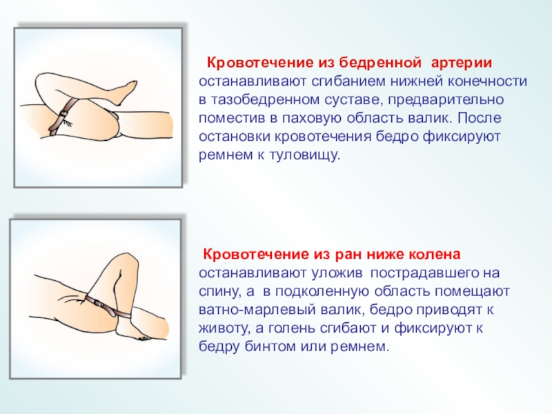 Кровотечение из ран ниже колена останавливают уложив пострадавшего на спину, а в подколенную область помещают ватно-марлевый валик, бедро приводят к животу, а голень сгибают и фиксируют к бедру бинтом или ремнем.