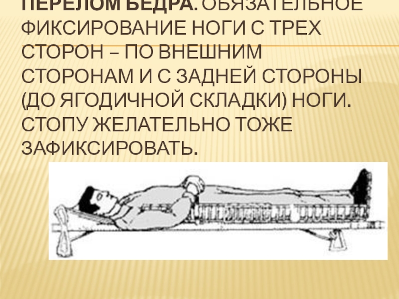 Слайд 10Перелом бедра. Обязательное фиксирование ноги с трех сторон – по внешним
