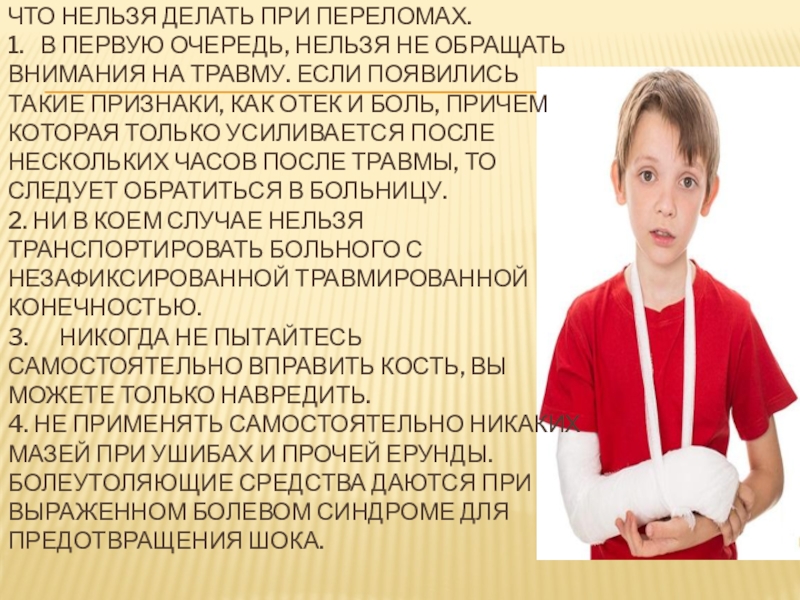переломах играет важную роль при лечении пострадавшего в дальнейшем. При оказании первой помощи необходимо действовать очень осторожно. Во-первых, вы можете усилить боль, а во-вторых, есть риск повреждения жизненно важных кровеносных сосудов и проходящих нервов в месте перелома.
