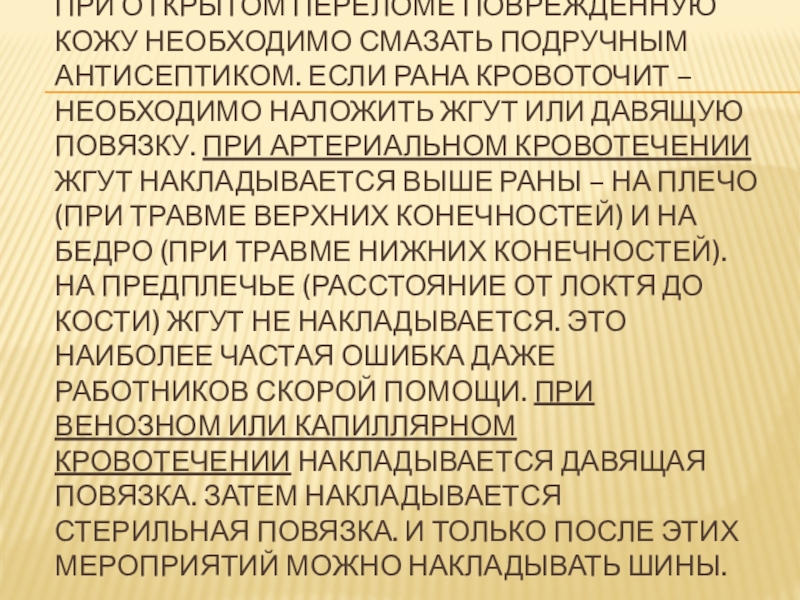 Слайд 7При открытом переломе поврежденную кожу необходимо смазать подручным антисептиком. Если рана