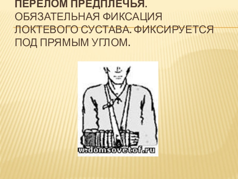 Слайд 9Перелом предплечья. Обязательная фиксация локтевого сустава. Фиксируется под прямым углом.