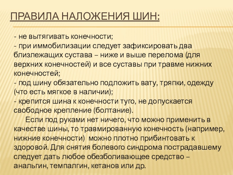 Если под руками нет ничего, что можно применить в качестве шины, то травмированную конечность (например, нижние конечности) можно плотно прибинтовать к здоровой. Для снятия болевого синдрома пострадавшему следует дать любое обезболивающее средство – анальгин, темпалгин, кетанов или др.