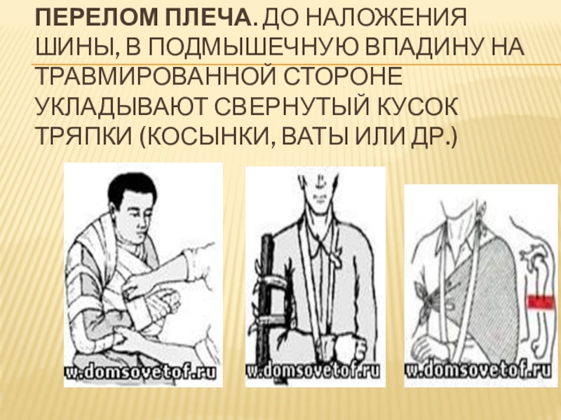 Слайд 8Перелом плеча. До наложения шины, в подмышечную впадину на травмированной стороне