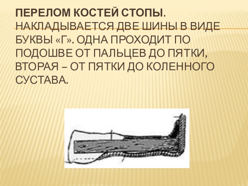 Слайд 13Перелом костей стопы. Накладывается две шины в виде буквы «Г». Одна
