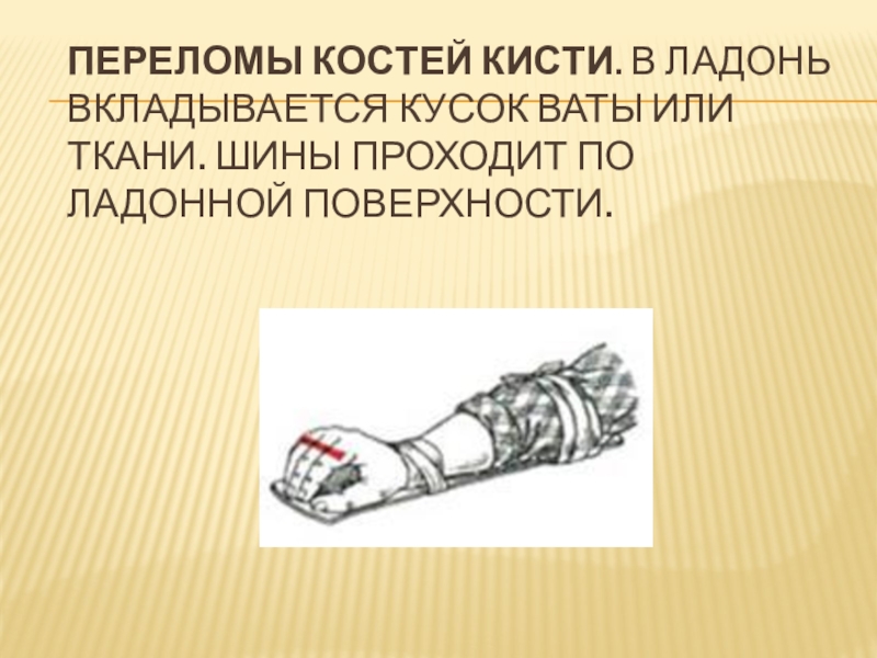 Слайд 11Переломы костей кисти. В ладонь вкладывается кусок ваты или ткани. Шины
