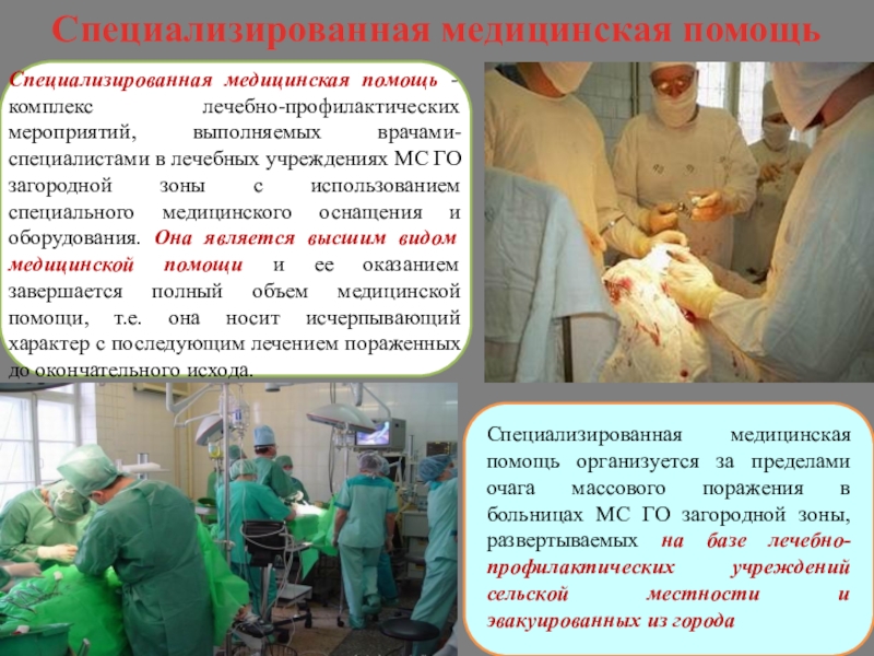 Специализированная медицинская помощь организуется за пределами очага массового поражения в больницах МС ГО загородной зоны, развертываемых на базе лечебно-профилактических учреждений сельской местности и эвакуированных из города