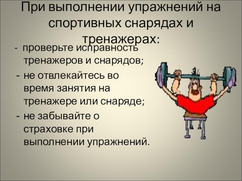 Слайд 11При выполнении упражнений на спортивных снарядах и тренажерах:
