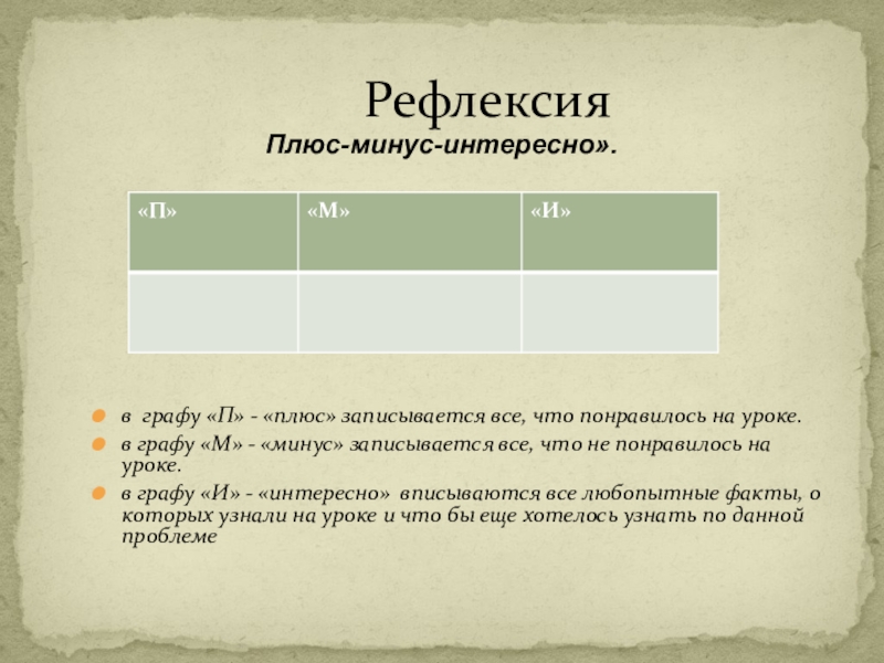 в графу «П» - «плюс» записывается все, что понравилось на уроке.