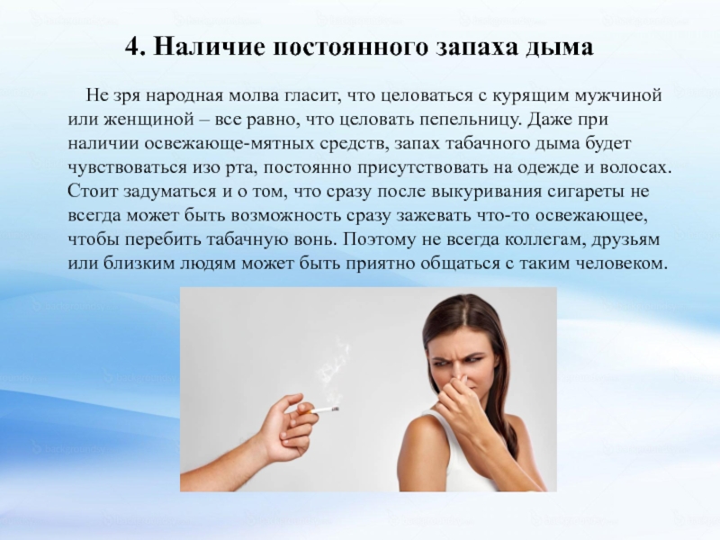 народная молва гласит, что целоваться с курящим мужчиной или женщиной – все равно, что целовать пепельницу. Даже при наличии освежающе-мятных средств, запах табачного дыма будет чувствоваться изо рта, постоянно присутствовать на одежде и волосах. Стоит задуматься и о том, что сразу после выкуривания сигареты не всегда может быть возможность сразу зажевать что-то освежающее, чтобы перебить табачную вонь. Поэтому не всегда коллегам, друзьям или близким людям может быть приятно общаться с таким человеком.