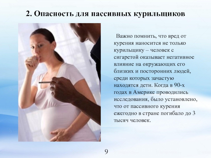 вред от курения наносится не только курильщику – человек с сигаретой оказывает негативное влияние на окружающих его близких и посторонних людей, среди которых зачастую находятся дети. Когда в 90-х годах в Америке проводились исследования, было установлено, что от пассивного курения ежегодно в стране погибало до 3 тысяч человек.