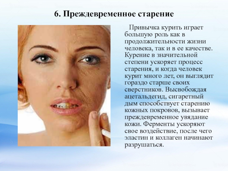 как в продолжительности жизни человека, так и в ее качестве. Курение в значительной степени ускоряет процесс старения, и когда человек курит много лет, он выглядит гораздо старше своих сверстников. Высвобождая ацетальдегид, сигаретный дым способствует старению кожных покровов, вызывает преждевременное увядание кожи. Ферменты ускоряют свое воздействие, после чего эластин и коллаген начинают разрушаться.