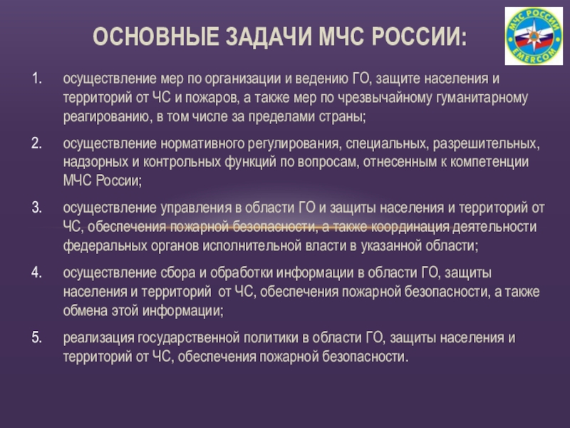 ОСНОВНЫЕ ЗАДАЧИ МЧС РОССИИ: