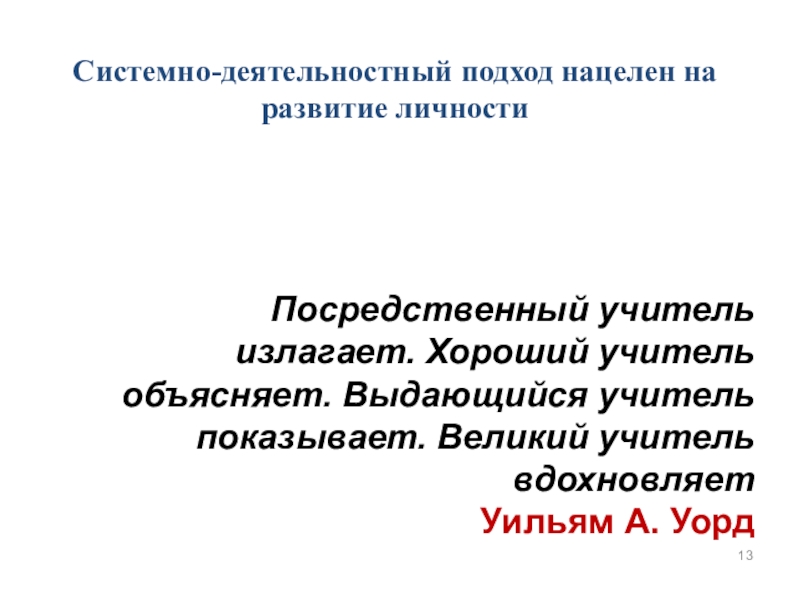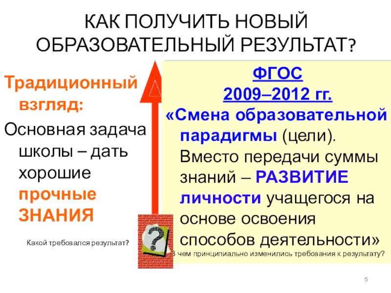 «Смена образовательной парадигмы (цели). Вместо передачи суммы знаний – РАЗВИТИЕ личности учащегося на основе освоения способов деятельности»