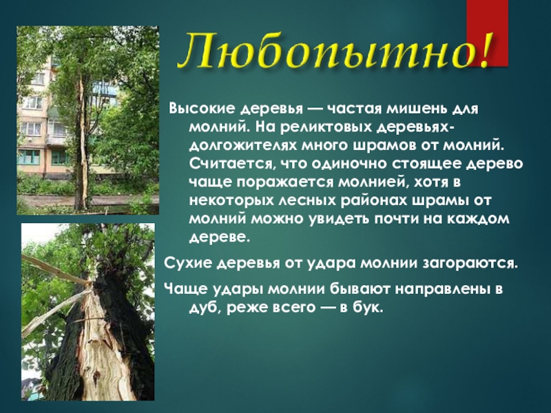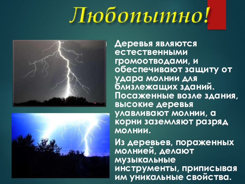 Слайд 16Деревья являются естественными громоотводами, и обеспечивают защиту от удара молнии для