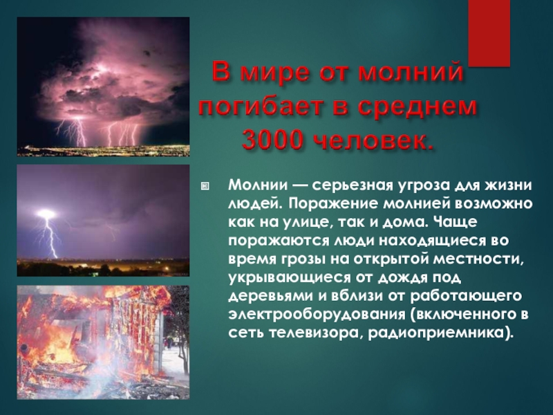 Слайд 18Молнии — серьезная угроза для жизни людей. Поражение молнией возможно как