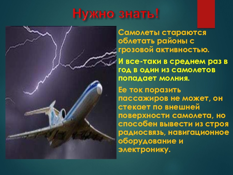 Ее ток поразить пассажиров не может, он стекает по внешней поверхности самолета, но способен вывести из строя радиосвязь, навигационное оборудование и электронику.
