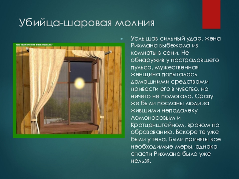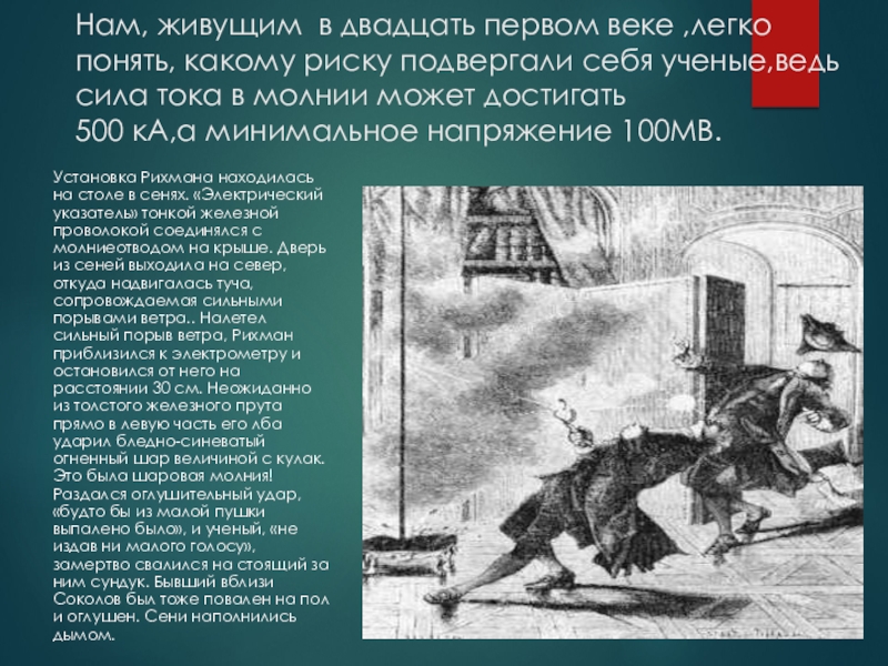 Установка Рихмана находилась на столе в сенях. «Электрический указатель» тонкой железной проволокой соединялся с молниеотводом на крыше. Дверь из сеней выходила на север, откуда надвигалась туча, сопровождаемая сильными порывами ветра.. Налетел сильный порыв ветра, Рихман приблизился к электрометру и остановился от него на расстоянии 30 см. Неожиданно из толстого железного прута прямо в левую часть его лба ударил бледно-синеватый огненный шар величиной с кулак. Это была шаровая молния! Раздался оглушительный удар, «будто бы из малой пушки выпалено было», и ученый, «не издав ни малого голосу», замертво свалился на стоящий за ним сундук. Бывший вблизи Соколов был тоже повален на пол и оглушен. Сени наполнились дымом.