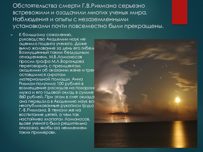 Слайд 11Обстоятельства смерти Г.В.Рихмана серьезно встревожили и озадачили многих ученых мира. Наблюдения