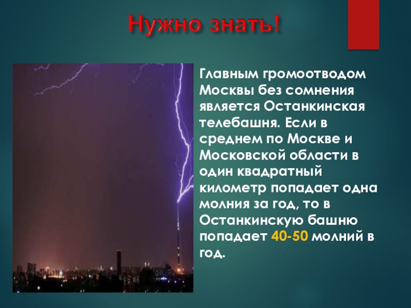 по Москве и Московской области в один квадратный километр попадает одна молния за год, то в Останкинскую башню попадает 40-50 молний в год.