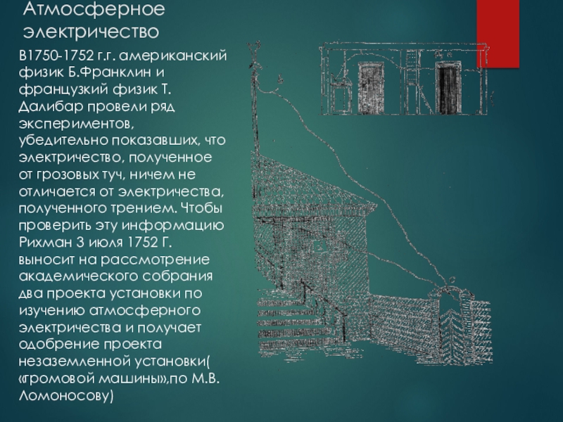 ряд экспериментов, убедительно показавших, что электричество, полученное от грозовых туч, ничем не отличается от электричества, полученного трением. Чтобы проверить эту информацию Рихман 3 июля 1752 Г.выносит на рассмотрение академического собрания два проекта установки по изучению атмосферного электричества и получает одобрение проекта незаземленной установки( «громовой машины»,по М.В.Ломоносову)