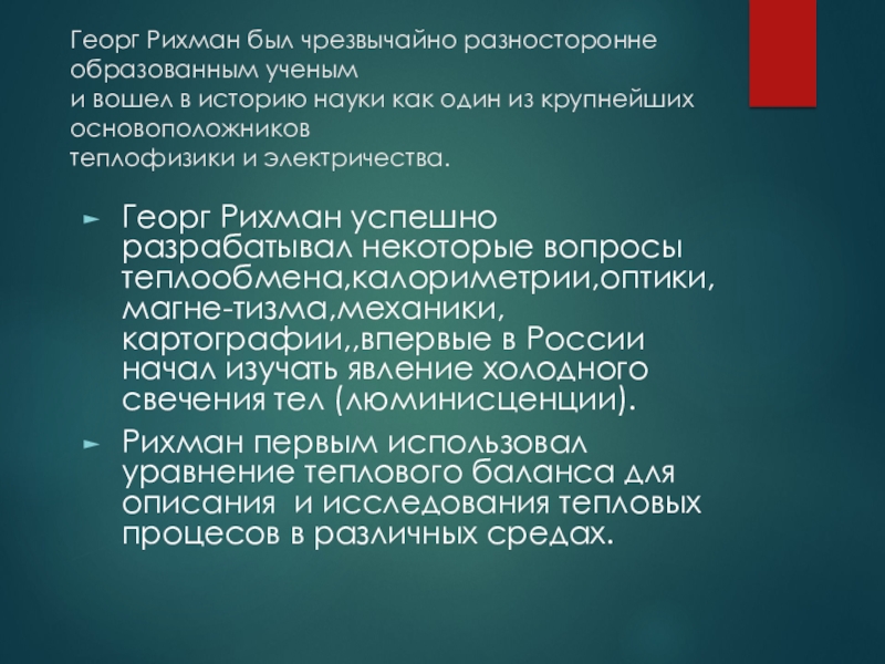 Слайд 3Георг Рихман был чрезвычайно разносторонне образованным ученым