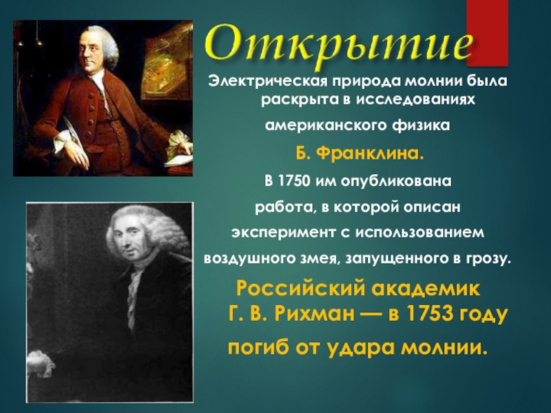 В1750-1752 г.г. американский физик Б.Франклин и французкий физик Т.Далибар провели