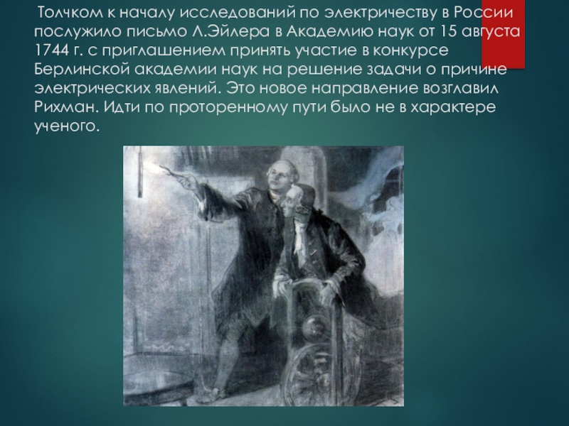 Л.Эйлера в Академию наук от 15 августа 1744 г. с приглашением принять участие в конкурсе Берлинской академии наук на решение задачи о причине электрических явлений. Это новое направление возглавил Рихман. Идти по проторенному пути было не в характере ученого.