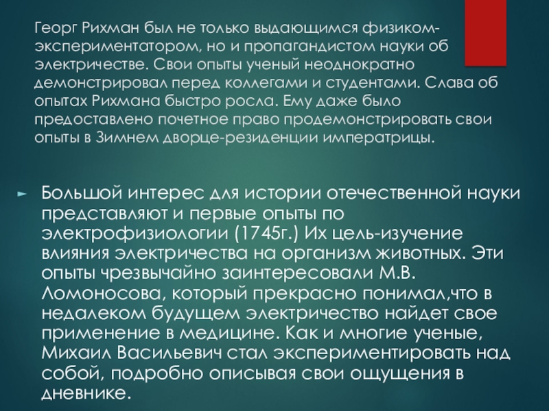 Большой интерес для истории отечественной науки представляют и первые опыты по электрофизиологии (1745г.) Их цель-изучение влияния электричества на организм животных. Эти опыты чрезвычайно заинтересовали М.В.Ломоносова, который прекрасно понимал,что в недалеком будущем электричество найдет свое применение в медицине. Как и многие ученые, Михаил Васильевич стал экспериментировать над собой, подробно описывая свои ощущения в дневнике.
