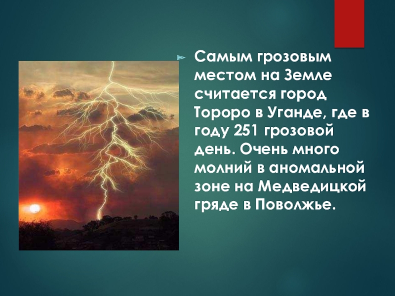 Слайд 14Самым грозовым местом на Земле считается город Тороро в Уганде, где