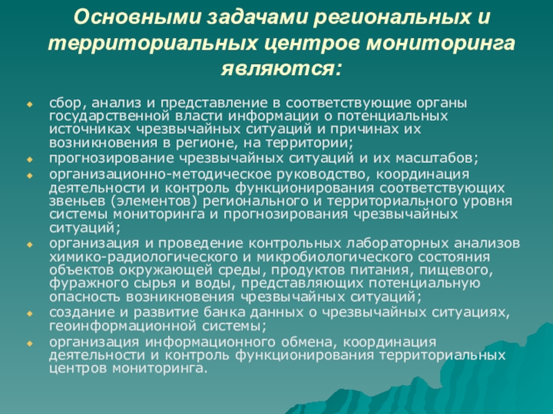 Основными задачами региональных и территориальных центров мониторинга являются: сбор, анализ и представление в соответствующие органы государственной власти
