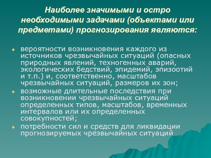 Наиболее значимыми и остро необходимыми задачами (объектами или предметами) прогнозирования являются:вероятности возникновения каждого из источников чрезвычайных ситуаций