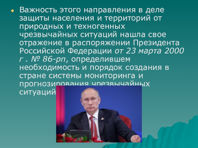 и техногенных чрезвычайных ситуаций нашла свое отражение в распоряжении Президента Российской Федерации от 23 марта 2000 г . № 86-рп, определившем необходимость и порядок создания в стране системы мониторинга и прогнозирования чрезвычайных ситуаций.